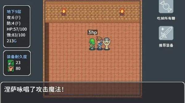 2. 地牢探險尋寶藏:在隨機生成的地牢中探索,開啟安全的寶箱可以獲得鐵甲糖、青銅劍、防護盾等裝備和道具,永久提升角色屬性或用于戰(zhàn)斗。