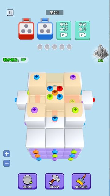 《最強螺絲王》玩法直觀,進入關卡后,屏幕會顯示帶多個螺絲的物體,可能是家具、玩具或機械部件。玩家用手指點擊選中螺絲,按住并按紋路方向旋轉即可擰下。部分螺絲有顏色區分或特殊鎖定,需先解鎖對應條件,比如先擰特定顏色螺絲。每完成一關,系統會按拆解速度和準確率評分,評分越高,解鎖的道具或獎勵越豐富,道具能幫玩家在后續關卡高效拆解,提升游戲體驗。