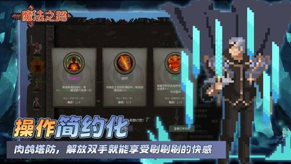 《魔法之路》以暗黑風格為基調,搭配復古像素畫面,讓劍與魔法的世界更具神秘感。玩家作為冒險者,無需復雜操作,即可快速融入游戲——核心目標是召集不同屬性的英雄,通過培養提升其實力,再利用塔防機制布置英雄,阻擋魔物入侵,守護這個奇幻世界。
